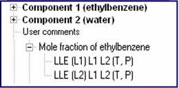 - (L1) L1 L2 (T,P): The mole fraction of component 1 (ethylbenzene) in liquid phase #1 (L1) with liquid phase #1 and liquid phase #2 present (L1 L2) as a function of temperature T and pressure P.