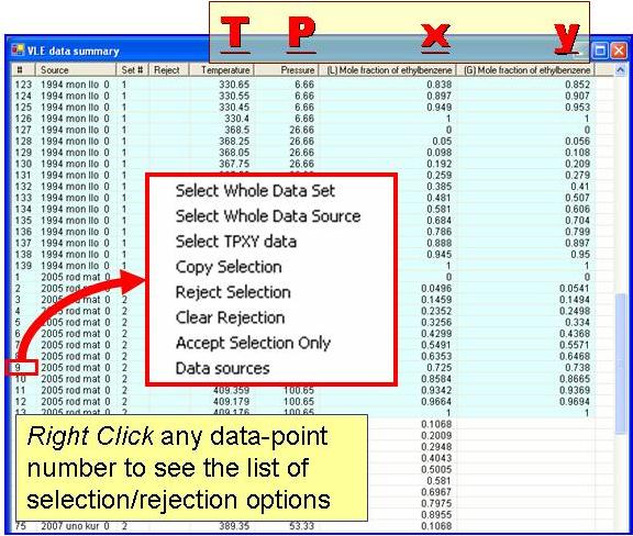 Vapor-Liquid Equilibrium (VLE) Data Summary: Selection/Rejection Options