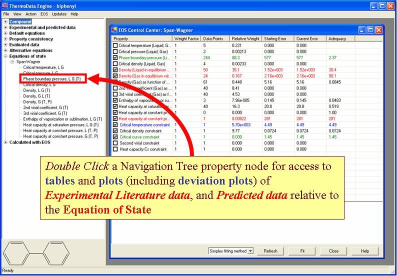 Provides access to Tables and Plots (including deviation plots) of Experimental Literature data, and Predicted data relative to Equation of State.