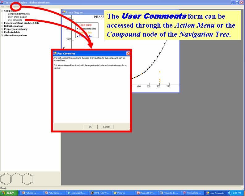 Selection of this menu item provides a form for text entry of comments by the user. The comments are stored with the experimental data and evaluation results (text only) for the compound. This feature is not supported in the ThermoML output.