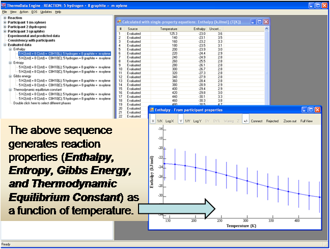 TDE can be used to evaluate formation properties for a compound for a range of temperatures. Phases and temperature ranges available for evaluation are dependent on the particular data scenario for a compound. TDE attempts to evaulate the enthalpy of formation and entropy of formation, followed by algebraic calculation of the Gibbs energy of formation and Thermodynamic Equilbrium Constant for the reaction.