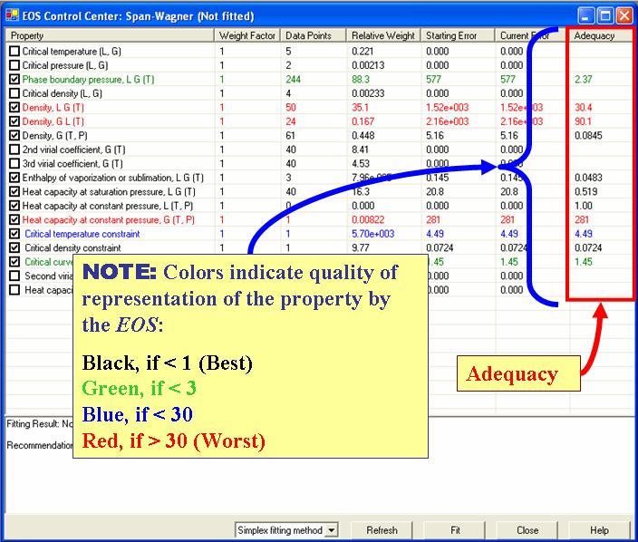 Adequacy is a function that indicates how well the EOS represents the property, and is calculated as the average squared deviation of the calculated value (with the EOS) from the experimental and predicted data multiplied by their statistical weight (as determined by TDE).