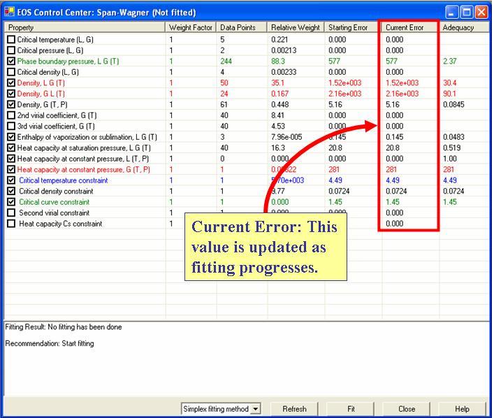 Current Error is the error function for the property after the last completed fitting cycle, and is calculated as the sum of the squared deviations of the calculated (with the EOS) values from the experimental and predicted data multiplied by their statistical weights (as determined by TDE).
