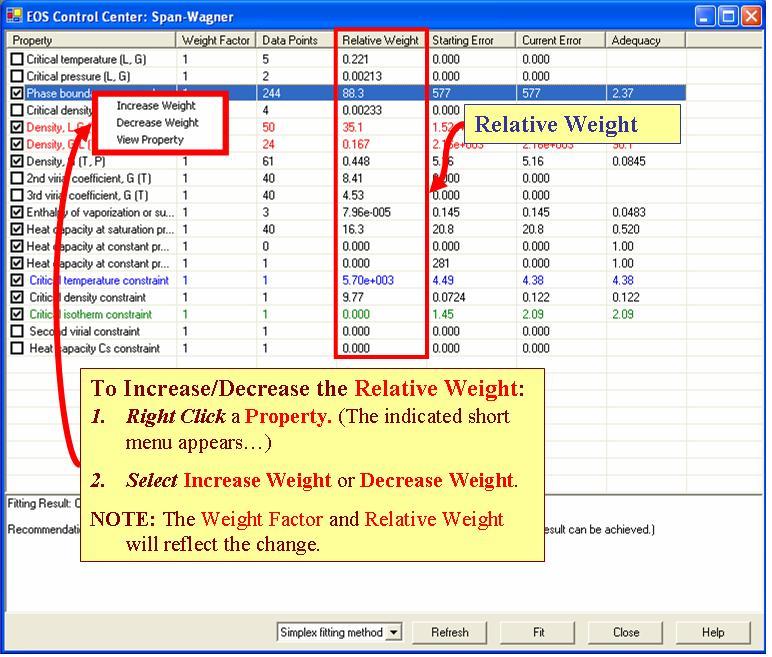 Relative weight is a function that represents the relative importance of the property in the fitting process, and is calculated as the sum of the squared property values multiplied by their statistical weights (as determined by TDE).