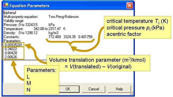 critical temperature: Tc, critical pressure: pc, acentric factor: w, parameters L, M, and N, and the volume translation term: vt